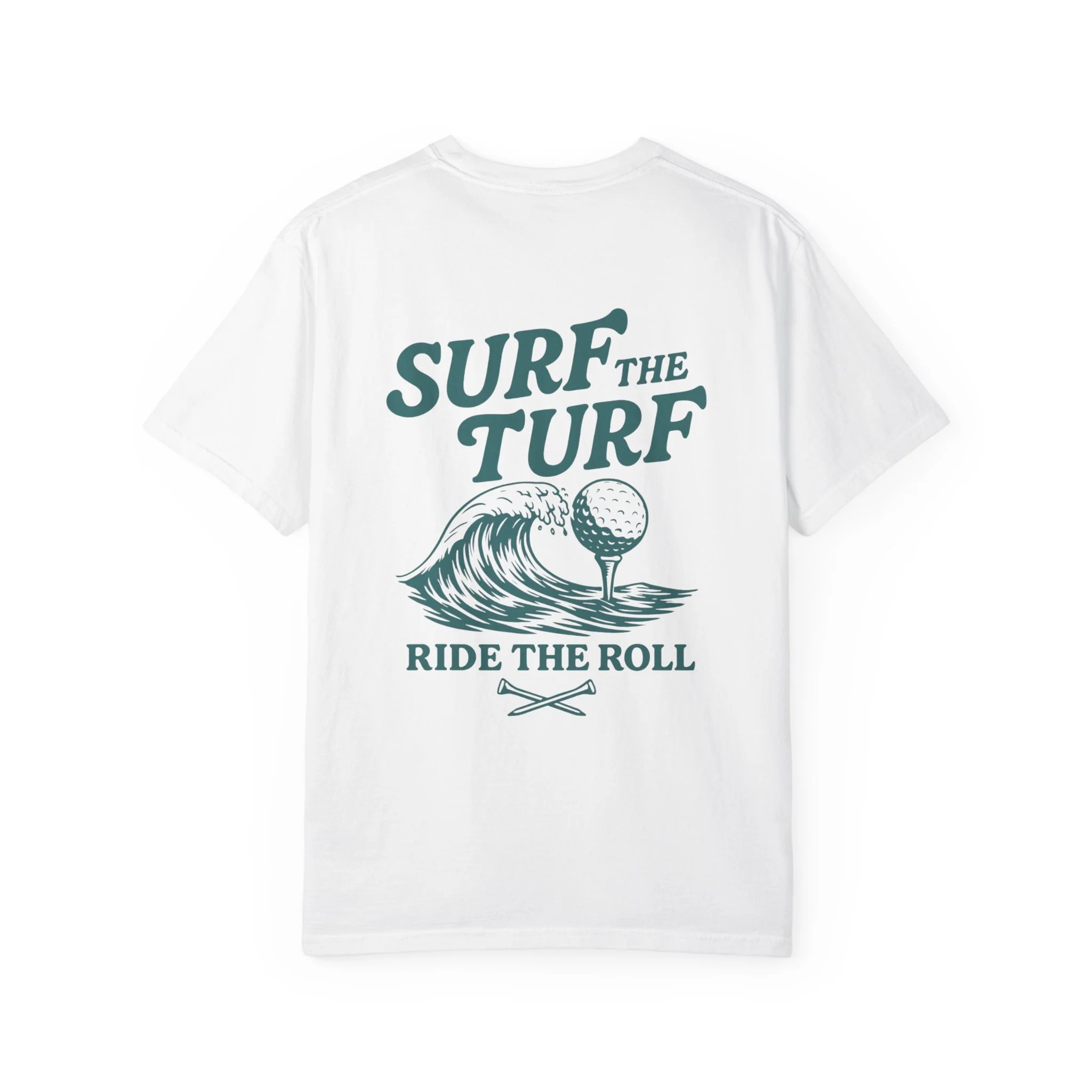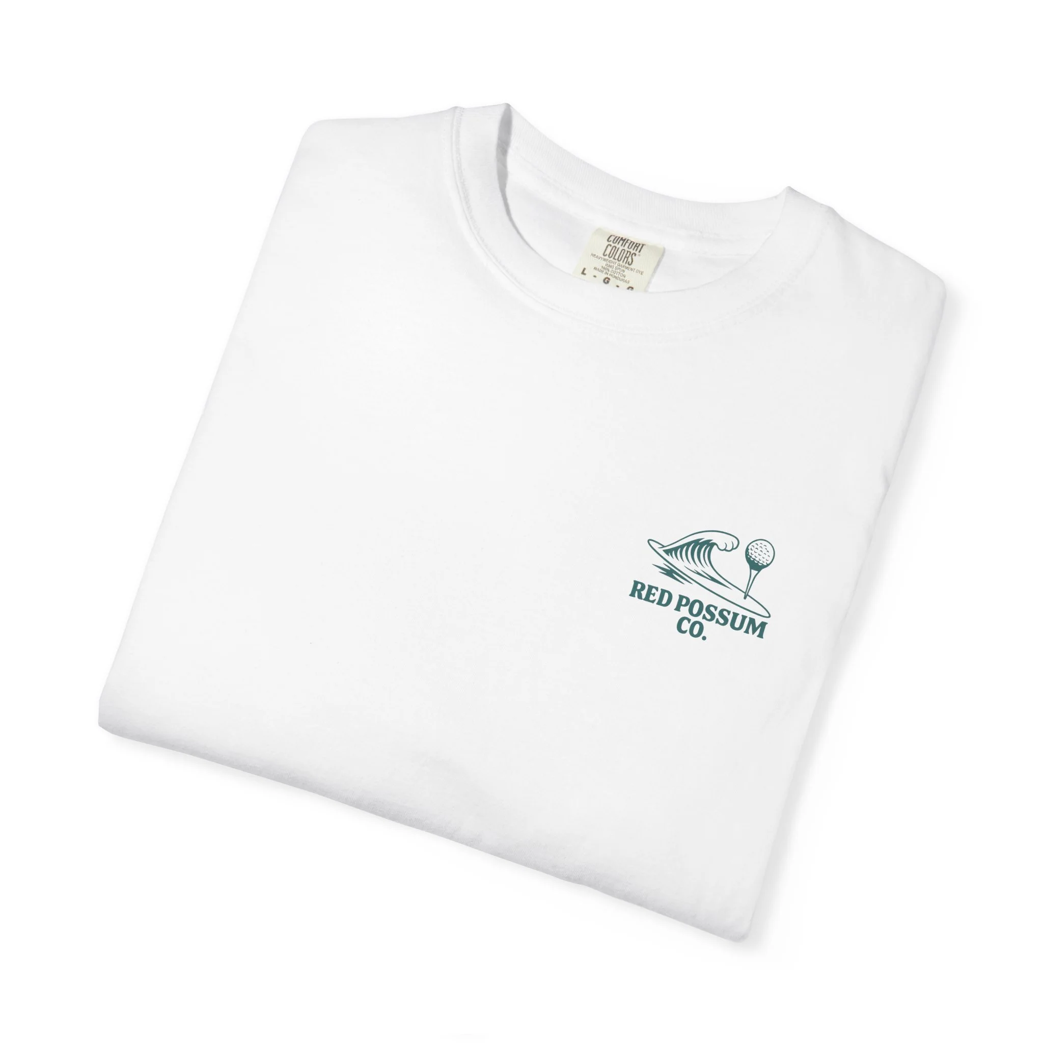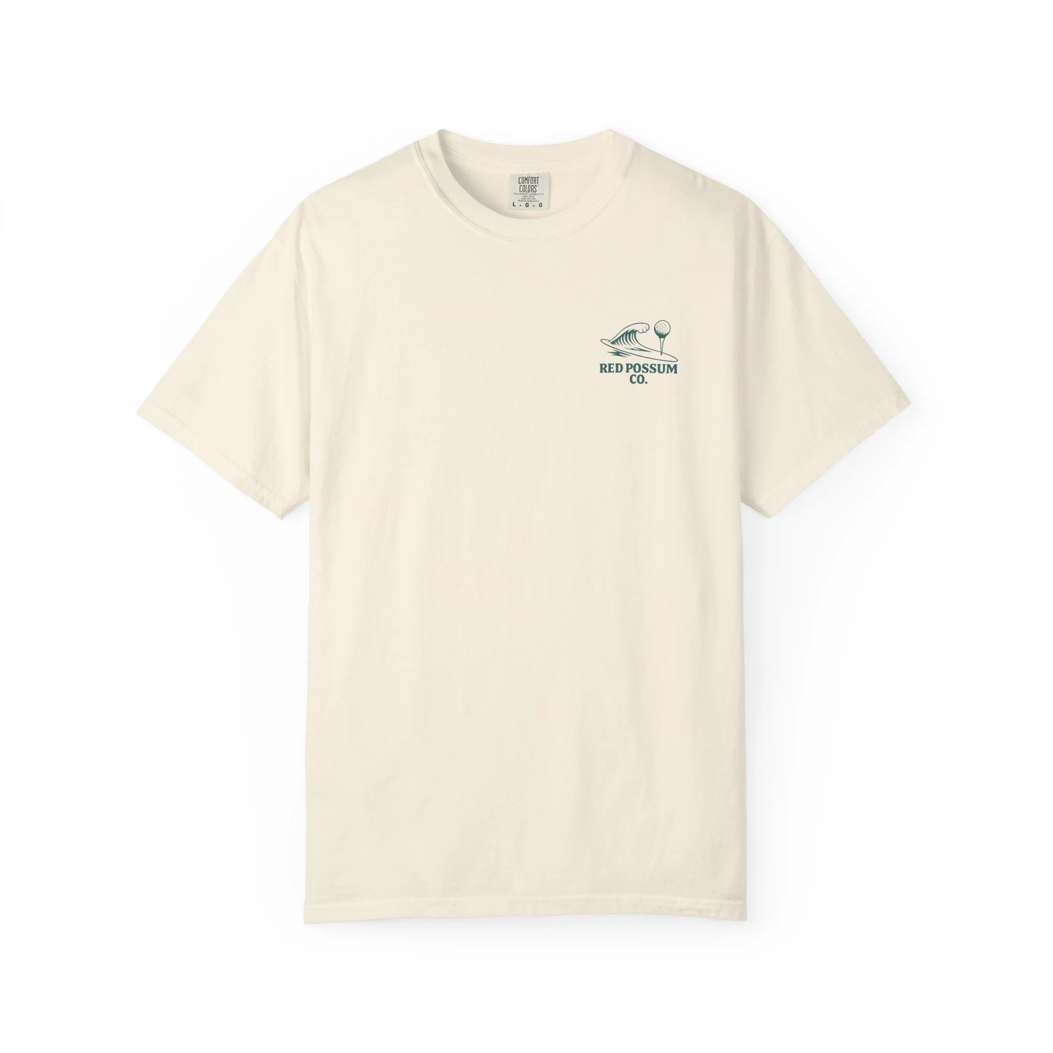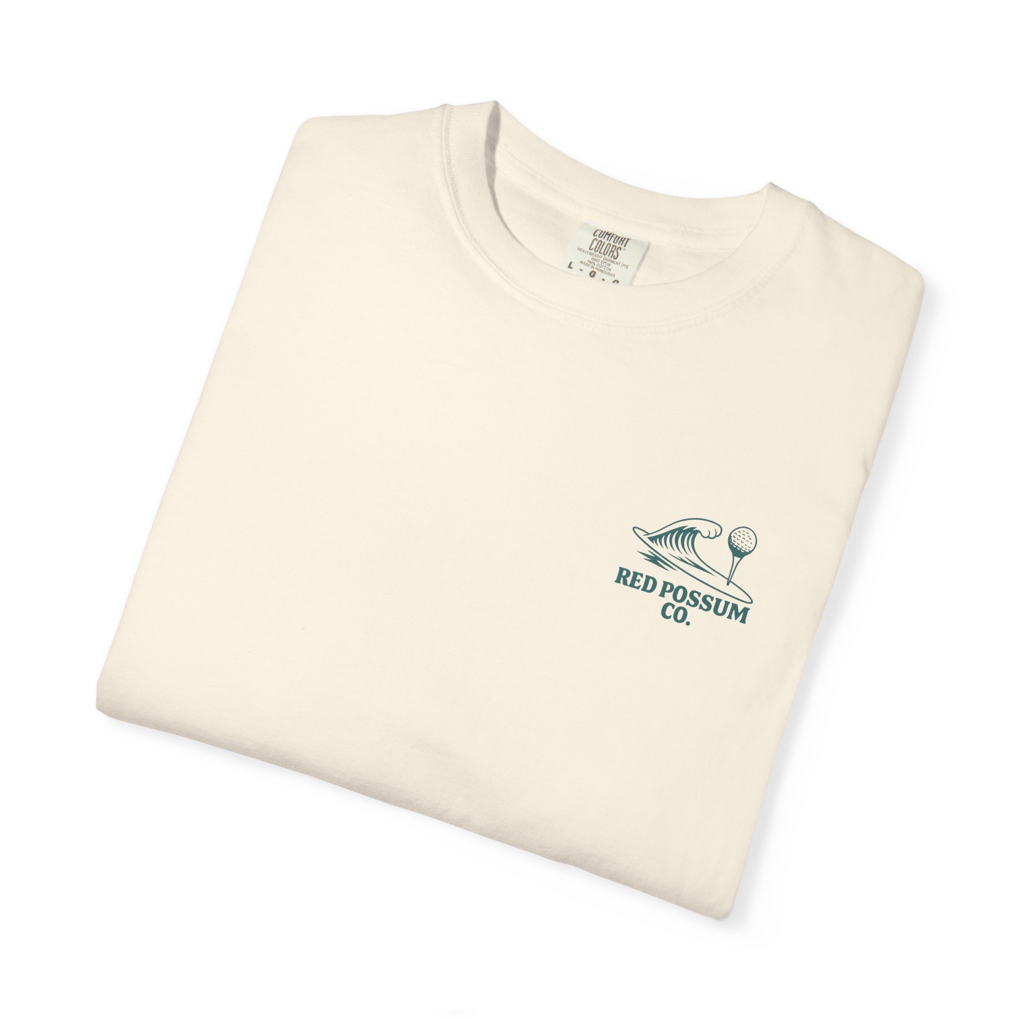 Made for those who chase the perfect wave and the perfect shot. With bold typography and a clean graphic of a wave and golf ball, this shirt blends laid-back coastal vibes with the rhythm of the course.